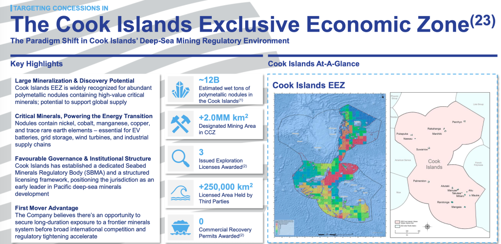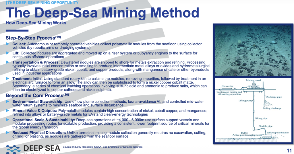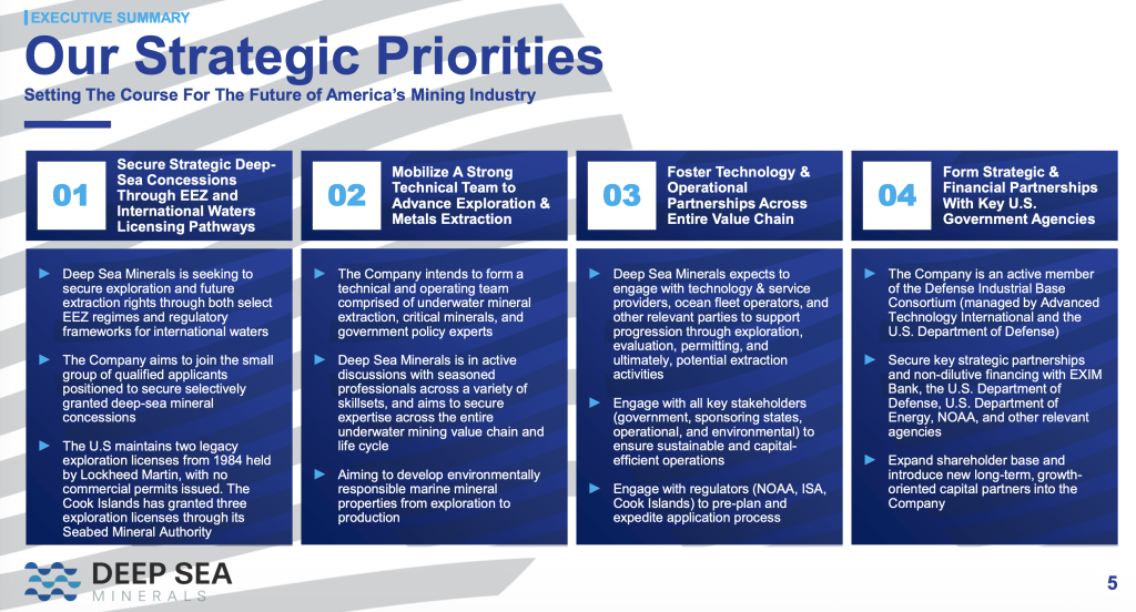 Deep Sea Minerals Corp. is a subsea mineral exploration and development company focused on evaluating opportunities to support the future supply of critical minerals through the acquisition, exploration, and development of deep-sea mineral assets. The Company’s strategy is centered on identifying jurisdictions and geological settings with potential exposure to polymetallic nodule systems, which are recognized for containing combinations of metals that may be relevant to defense, industrial manufacturing, clean energy infrastructure, advanced electronics, and artificial intelligence-related supply chains. These seabed resources represent a largely undeveloped component of the global mineral supply base and are the subject of increasing policy, scientific, and regulatory attention worldwide. As part of this process, the Company has commenced early-stage engagement with selected governments and regulatory bodies in the Pacific Ocean region to assess potential pathways for future exploration initiatives, subject to applicable international, national, and environmental frameworks.